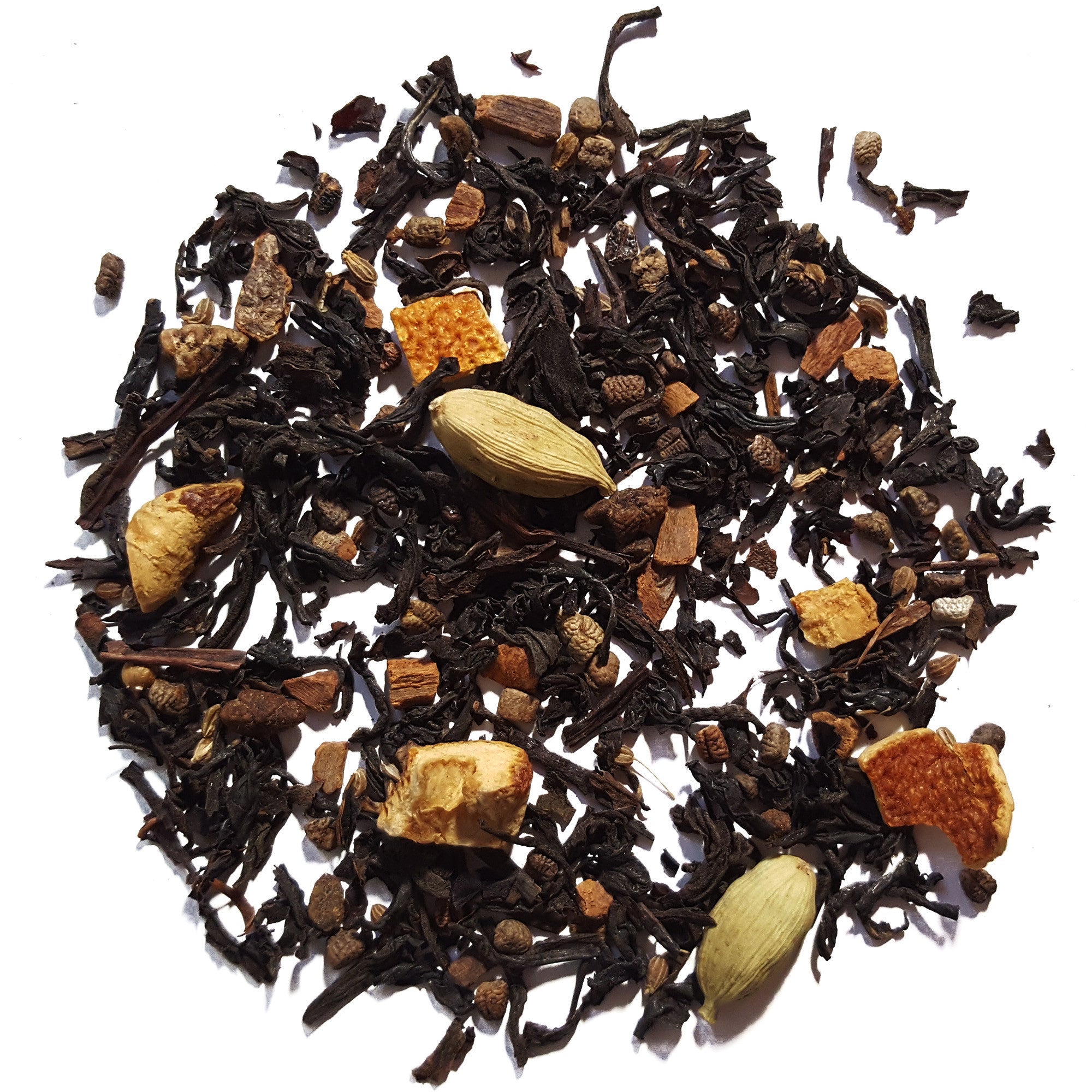 Té negro especiado originario de la India a base de té negro, canela, clavo, cardamomo, jengibre y trozos de naranja.